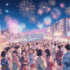 夜空に咲く花火:千住の川辺に打ち上がる光の花火と、それを見上げる人々の笑顔が描かれています。